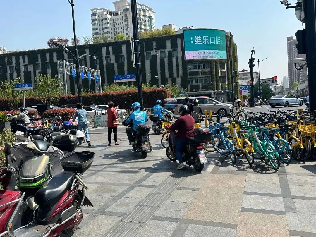 此前,有市民反映,上海楊浦區(qū)五角場(chǎng)街道淞滬路與政通路交會(huì)處的某商廈周邊,每到用餐高峰時(shí)段交通秩序混亂。人行道上外賣車輛與共享單車肆意停放,通行空間僅剩一人寬度。政通路人行道又缺少物理隔離設(shè)施,電瓶車隨意在人流中穿行,險(xiǎn)象環(huán)生。