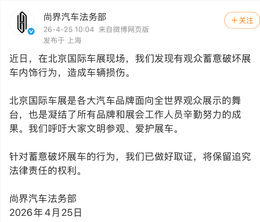 (記者 陸鵬鵬)4月25日,尚界汽車(chē)法務(wù)部就北京國(guó)際車(chē)展有人蓄意破壞展車(chē)一事發(fā)文: