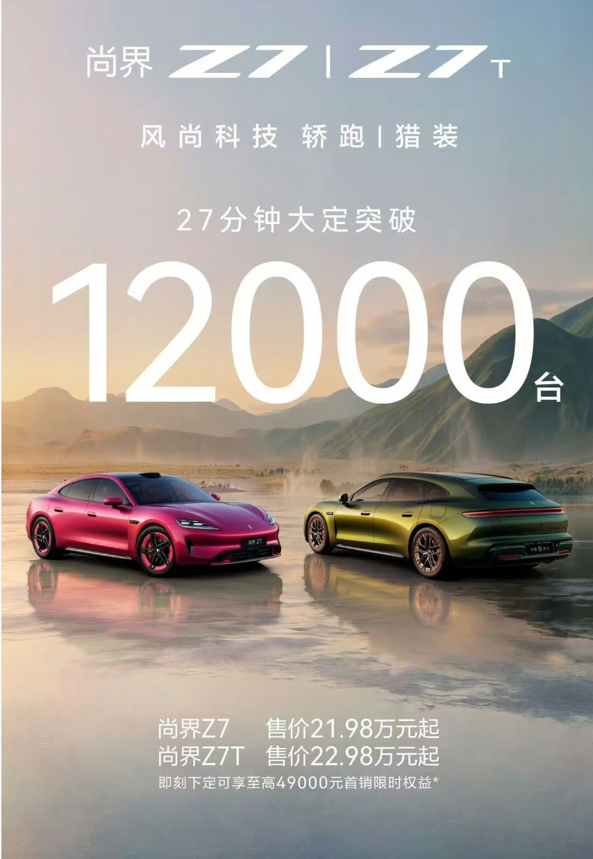 尚界品牌由上汽與華為合作打造,該品牌最新車(chē)型尚界Z7和Z7T于昨天正式發(fā)布,售價(jià)21.98萬(wàn)元/22.98萬(wàn)元起。根據(jù)鴻蒙智行官方最新數(shù)據(jù),尚界Z7/Z7T兩款新車(chē)27分鐘大定破1.2萬(wàn)臺(tái)。