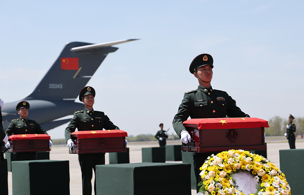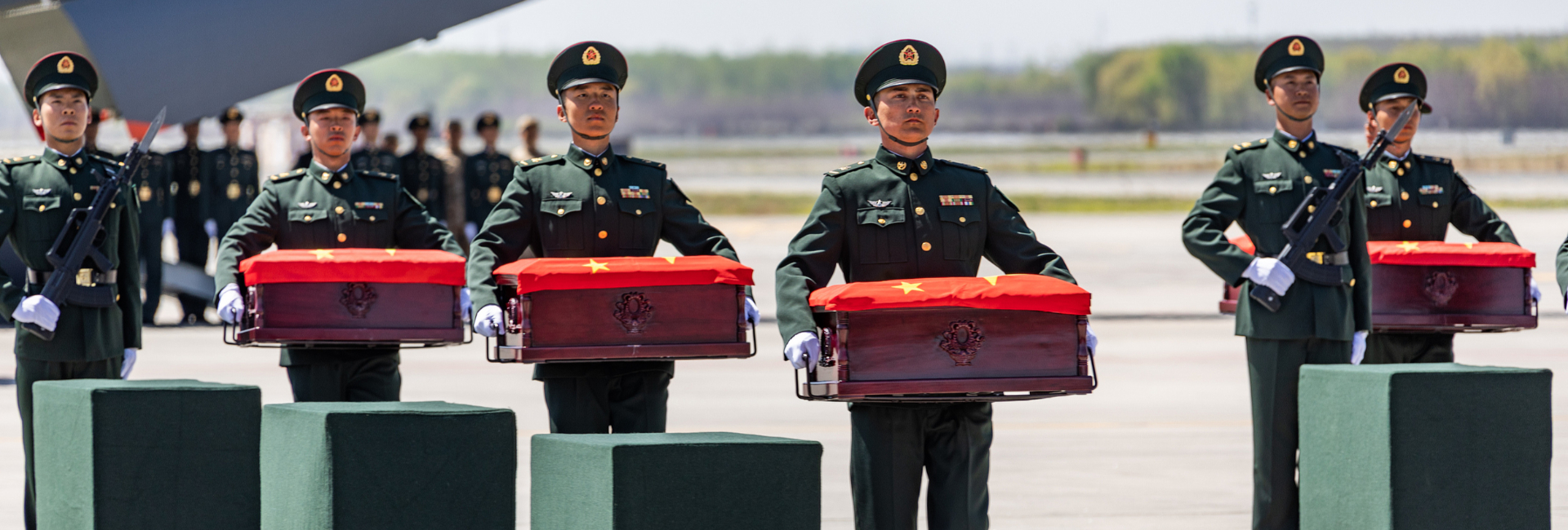 4月22日上午,中韓雙方在韓國仁川國際機場共同舉行交接儀式,韓方向中方移交第十三批12位在韓中國人民志愿軍烈士遺骸及146件遺物。退役軍人事務(wù)部副部長徐耀率中方交接代表團、韓國國防部次官李斗熙率韓國送還中國軍人遺骸代表團出席儀式。中韓雙方代表現(xiàn)場簽署交接書,中方舉行悼念儀式,現(xiàn)場唱響中華人民共和國國歌,中國駐韓國大使戴兵為志愿軍烈士棺槨覆蓋國旗,中方全體人員向志愿軍烈士遺骸行三鞠躬禮,中國人民解放軍儀仗司禮大隊禮兵持國旗護送烈士棺槨登上解放軍空軍運-20B運輸機,烈士英靈將回到祖國和人民懷抱。