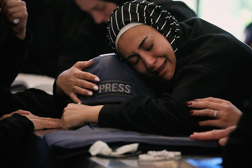 當?shù)貢r間2026年4月23日,黎巴嫩南部巴耶薩里耶村,黎巴嫩記者阿瑪勒·哈利勒的姐姐扎伊娜布懷抱著她的頭盔,在棺材前哀悼。