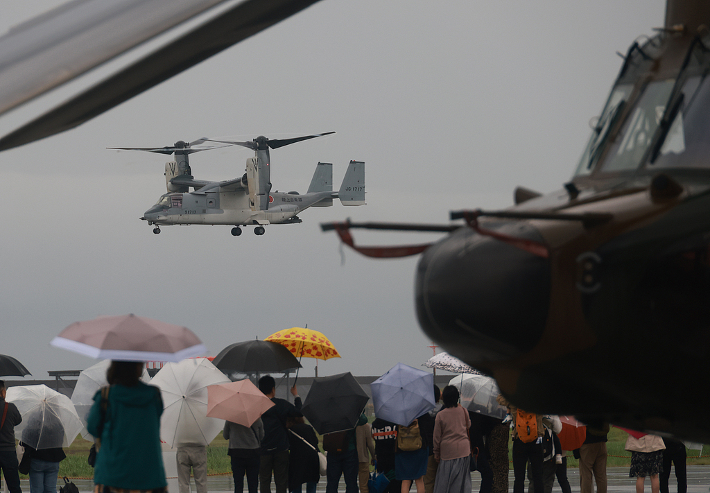 當?shù)貢r間2026年4月26日,日本佐賀縣佐賀市,日本陸上自衛(wèi)隊佐賀駐屯地內(nèi)一架“魚鷹”運輸機進行飛行演示。