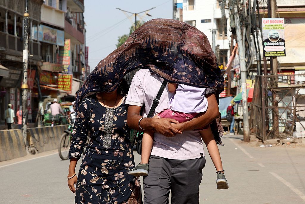 作為世界上人口最多的國家,印度夏季高溫可能十分嚴酷,使數(shù)百萬人面臨風(fēng)險。根據(jù)政府數(shù)據(jù),2012年至2021年間,有近1.1萬人死于中暑。當?shù)貢r間2026年4月24日,印度瓦拉納西,一個家庭用布遮擋面部走在炎熱夏日的街道上。