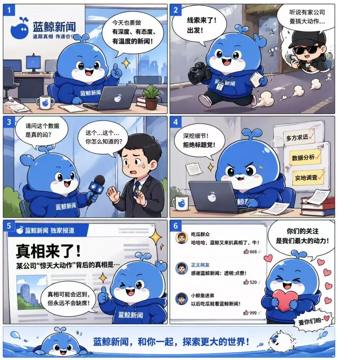 除了海報外,記者還讓模型生成了一組以藍鯨新聞為主題的漫畫,這一次,Images 2.0展現(xiàn)了它在多模態(tài)敘事上更強的思考能力。