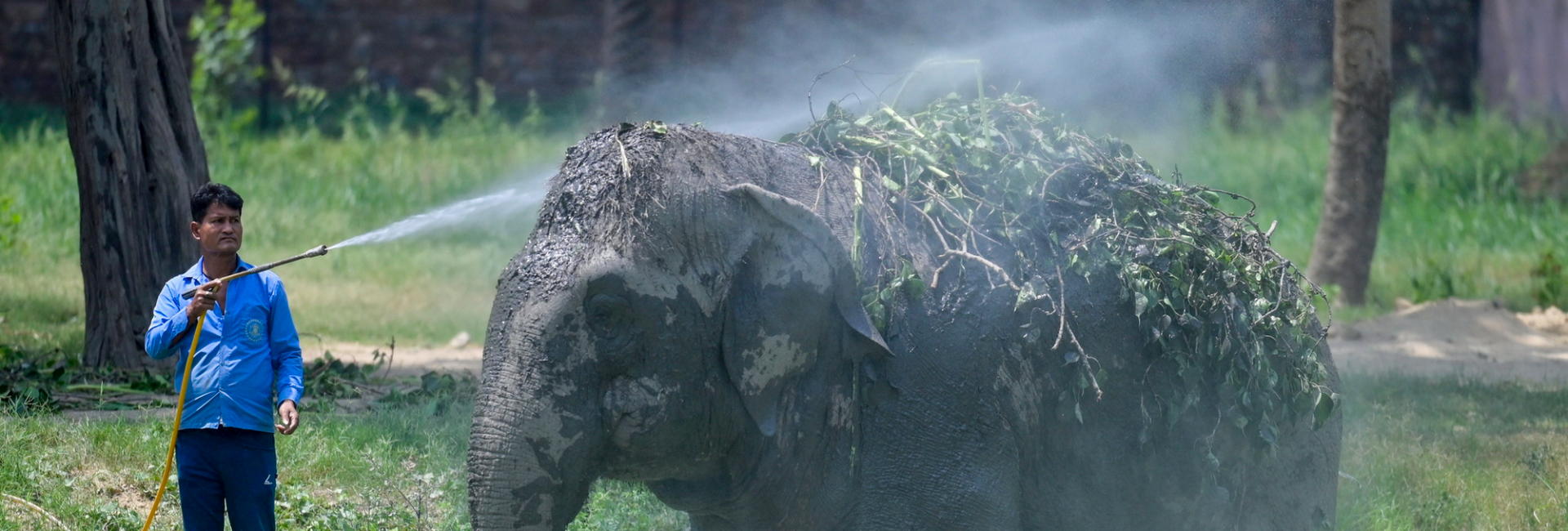 4月24日,印度新德里,一名動物園工作人員在國家動物園的圍欄內(nèi)用噴水裝置為大象淋浴降溫。