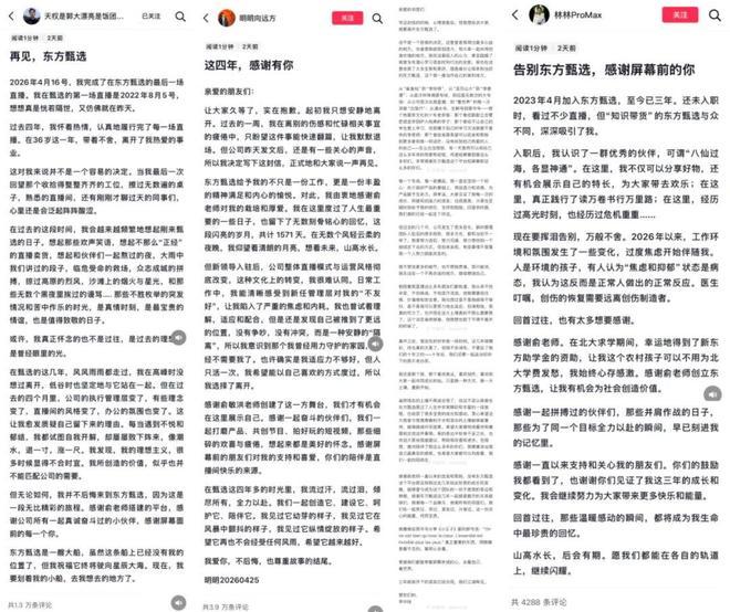 離職事件中,人氣主播明明、天權(quán)、中燦、林林陸續(xù)發(fā)文宣布離開東方甄選。