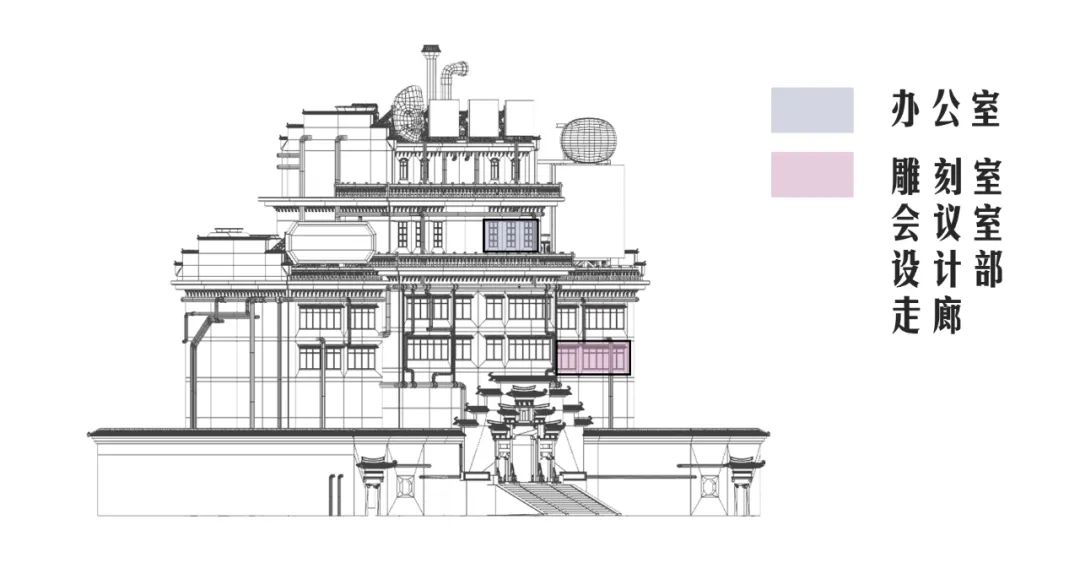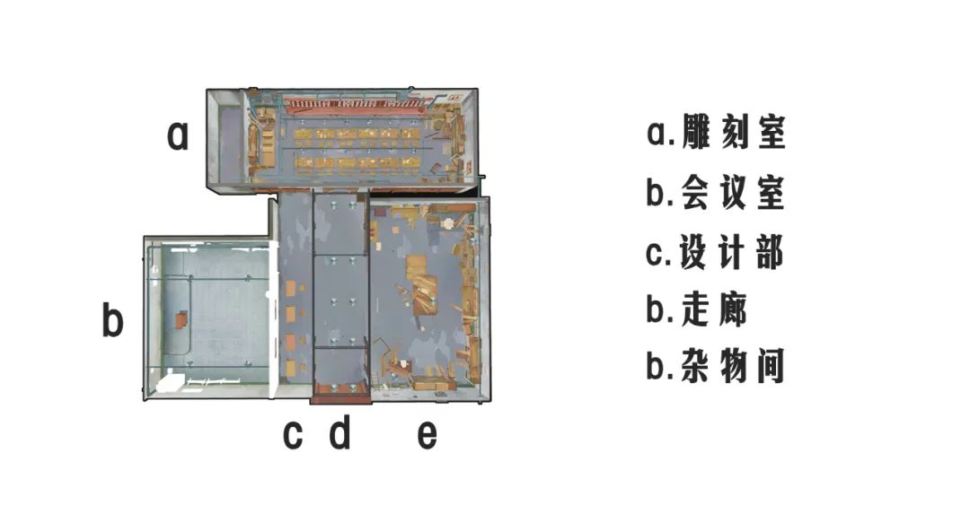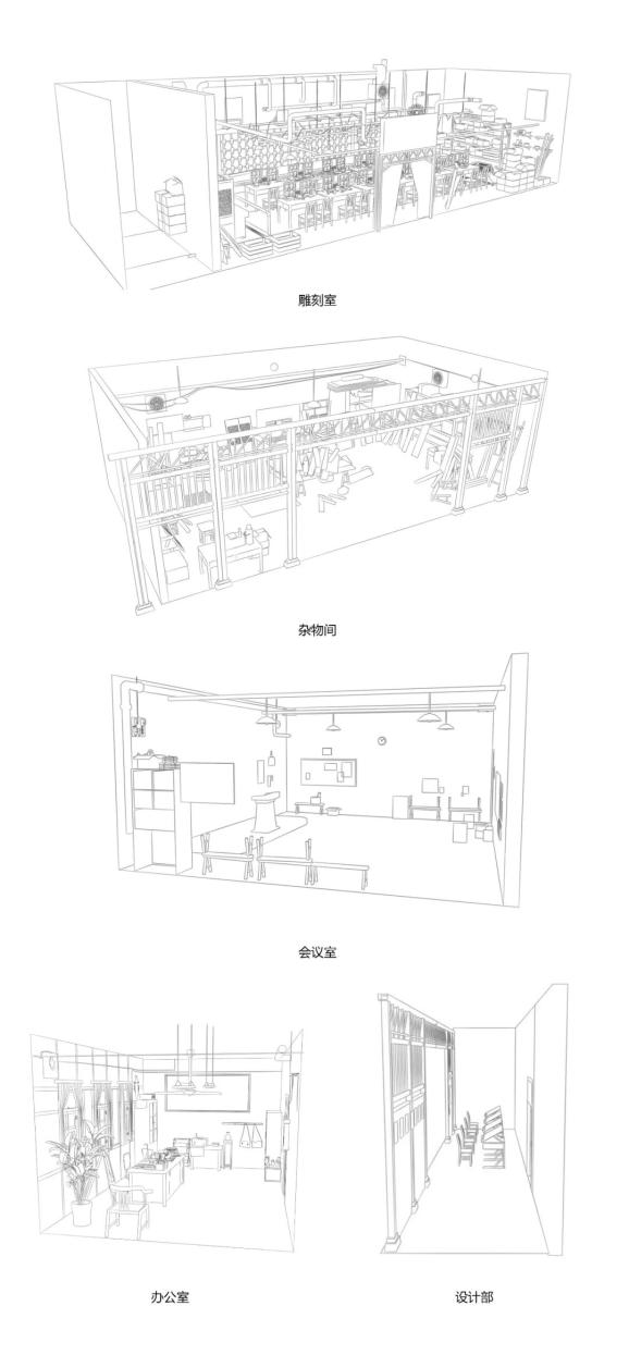 設(shè)計(jì)部、雕刻室、走廊、雜物間、會(huì)議室、辦公室.